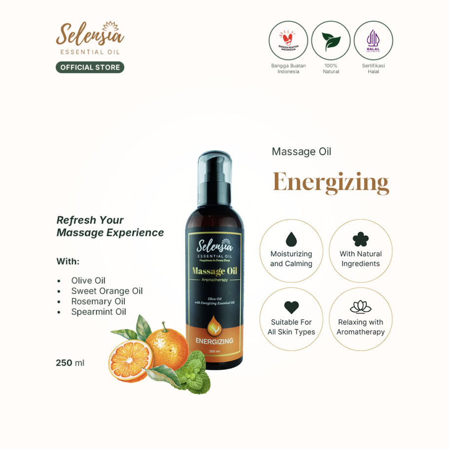 Selensia Energizing (Massage Oil Aromatherapy) merupakan minyak pijat alami yang mampu melembabkan kulit. Kandungan vitamin E alami dalam Olive Oil menutrisi dan meremajakan kulit, serta aroma essential oil dalam massage oil membantu tubuh dan pikiran menjadi lebih segar.